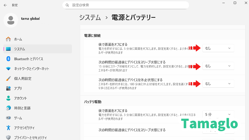 移行中は旧PCの電源設定を「スリープしない」に変更してコピー中断を防ぎます。