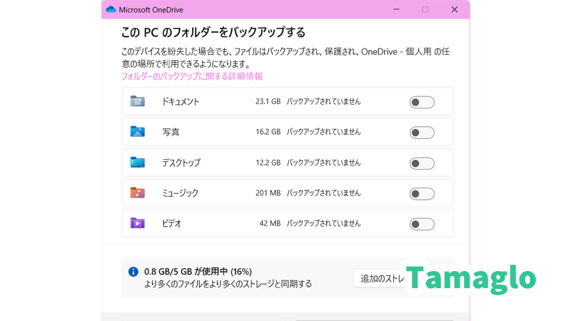 OneDriveの「フォルダのバックアップ(デスクトップ/ドキュメント/ピクチャ)」を有効にします。同期対象を絞ると容量を節約できます。