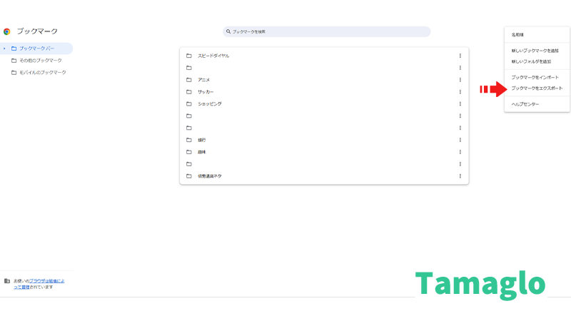 - 手動:ブックマークマネージャ→「ブックマークをエクスポート」