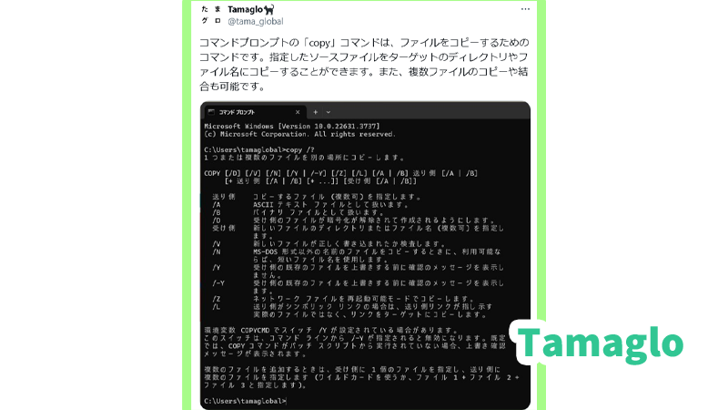 copyコマンドは、Windowsのコマンドプロンプトでファイルをコピーするための基本的なコマンドです。このコマンドを使用することで、1つまたは複数のファイルを別の場所にコピーすることができます。シンプルな操作でファイルのバックアップを作成したり、複数のファイルを1つのファイルに結合することも可能です。