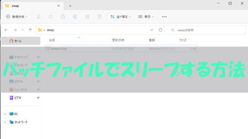 バッチファイルでスリープするにはtimeoutコマンドを使用します。使い方などは下記のブログをご覧ください。