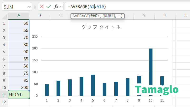 =AVERAGE(A1:A10)→ A1~A10の平均値を計算。