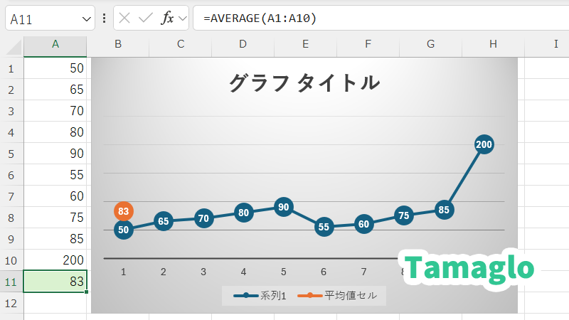 =AVERAGE(範囲)で平均値を計算し、別セルに配置- グラフに新しい系列として「平均値セル」を追加