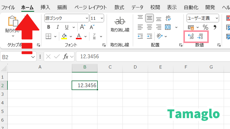 - ホームタブで小数点以下を0桁にして「12」と表示させた場合