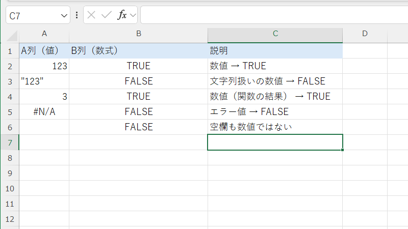 | 5 | 空欄 | =ISNUMBER(A6) | FALSE | 空欄も数値ではない |