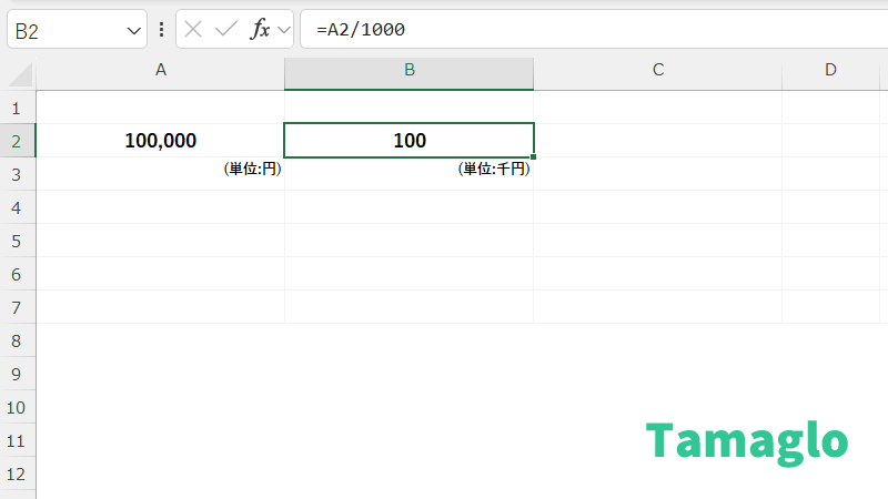 オートフィルで下までコピーすれば、A列の円単位の値を、B列では千円単位で扱えるようになります。