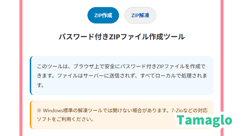 当サイトの「ZIPパスワード設定ツール」では、おおむね次のようなことができます。