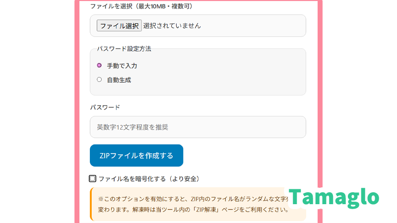 ブラウザだけでZIPにパスワードをかけられるオンラインツールが便利です。