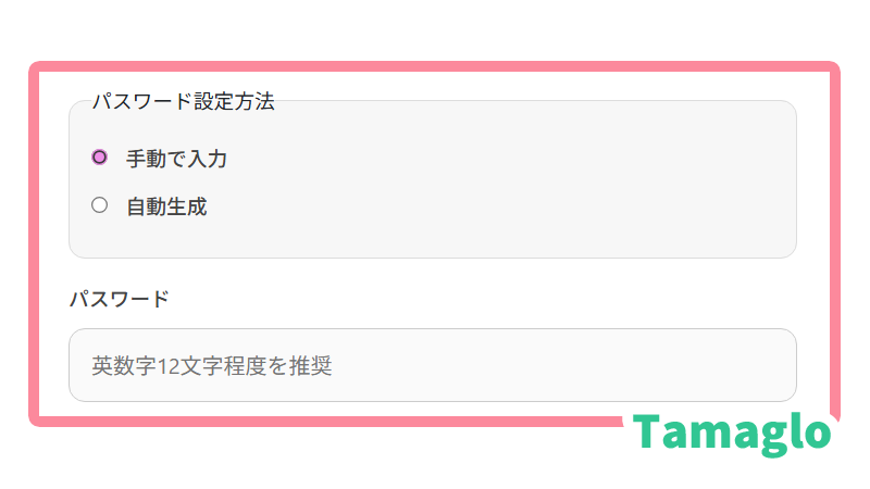 - パスワードを手動入力または自動生成で設定