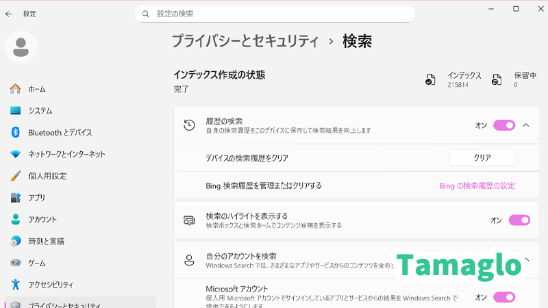 設定 > プライバシーとセキュリティ > 検索