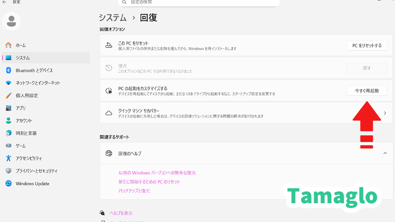 強制終了のあと、再起動してセーフモードも試しました。設定アプリから「システム」→「回復」→「今すぐ再起動」でトラブルシューティング画面に入り、「スタートアップ設定」を選んで再起動。セーフモードで Windows は起動します。