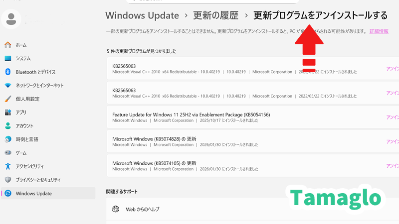 設定アプリを開き、「Windows Update」→「更新の履歴」へ進みます。そこから「更新プログラムをアンインストール」を開くと、インストール済みの更新が一覧で出ます。ここで KB5072033 を選んでアンインストール。
