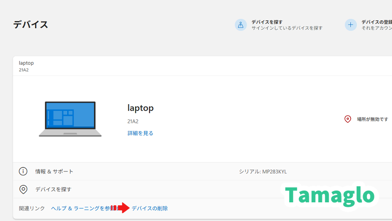 - デバイスページで該当PCを削除(切り離し)