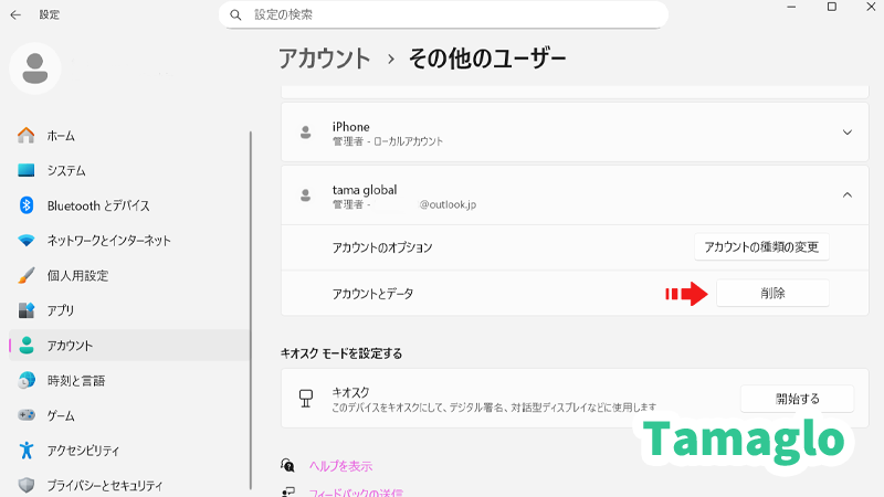 - Windows 11で「設定」→「アカウント」→「その他のユーザー」を開き、Microsoftアカウント項目の管理や削除を実行