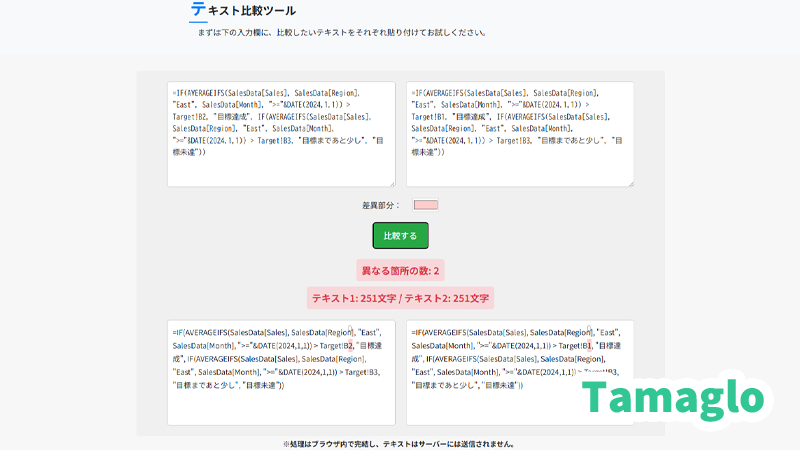 「テキスト比較ツール(無料)|文章・Excel式・コードの違いを色分け表示」