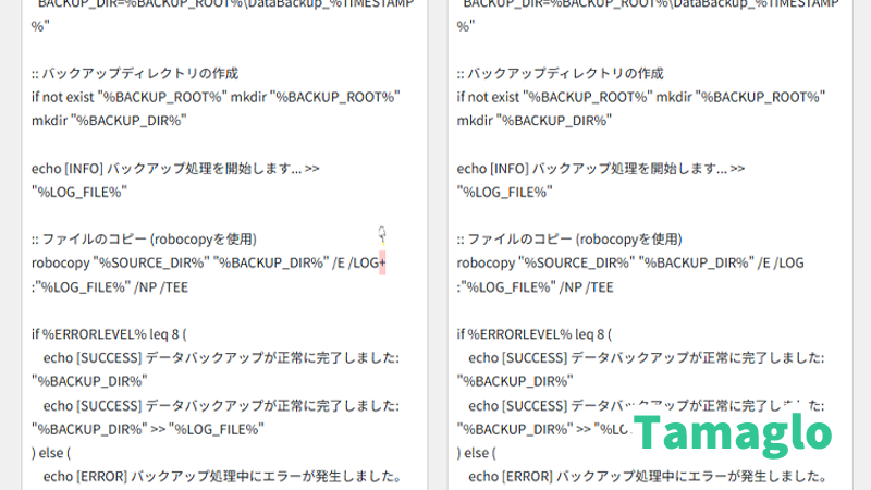 バッチファイルやPowerShellスクリプト、.ini や .conf のような設定ファイルは、1文字違うだけで動作が変わることも多く、差分チェックのメリットが大きい領域です。