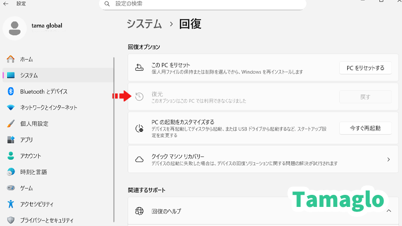「設定 → システム → 回復」を開いたのに、このオプションはこのPCでは利用できなくなりましたと表示されて「戻す」が押せない。そんなときは、まず不具合ではなく仕様の結果だと捉えるのが正解です。ここでいう「戻す」は、復元ポイントに戻す機能とは別物で、満たすべき条件が存在します。