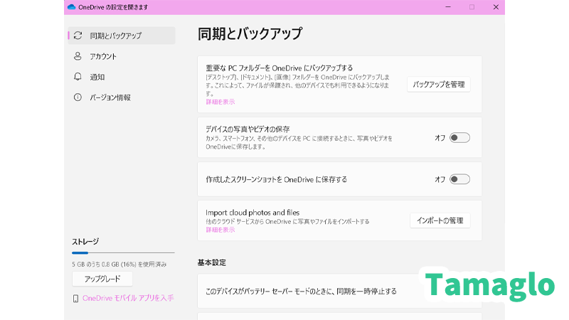 OneDriveの「フォルダのバックアップ(デスクトップ/ドキュメント/ピクチャ)」を有効にします。同期対象を絞ると容量を節約できます。