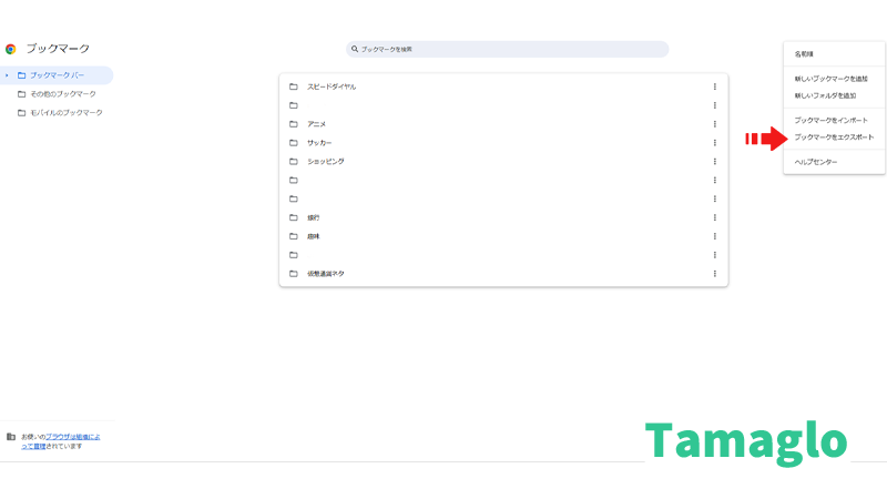 - 手動:ブックマークマネージャ→「ブックマークをエクスポート」